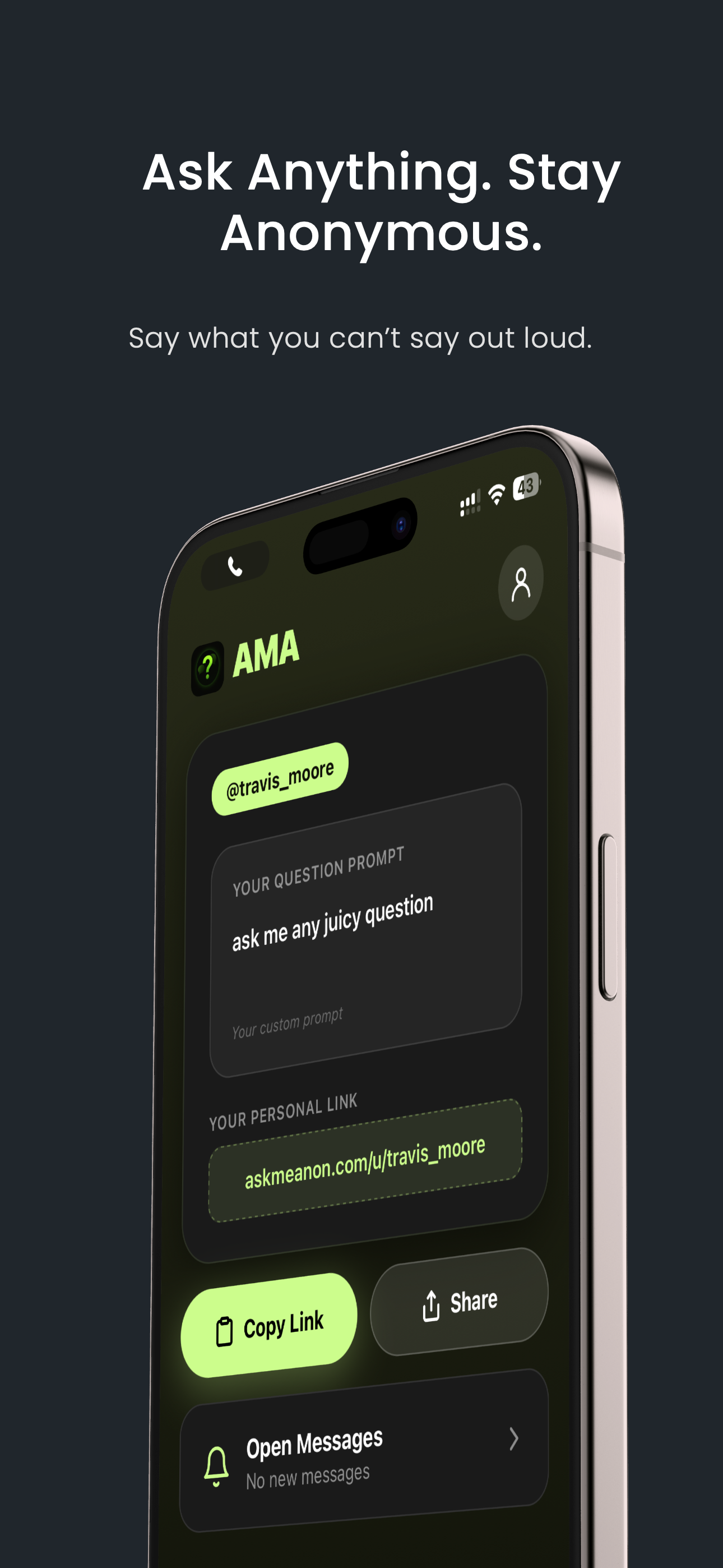 Say what you can't say out loud. Create your profile, get a unique link like askmeanon.com/u/travis_moore, set your question prompt, and share it everywhere.